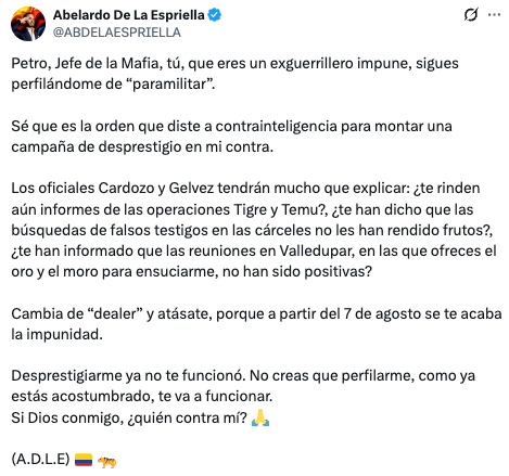 El candidato presidencial del movimiento cívico Defensores de la Patria, Abelardo de la Espriella, denunció públicamente una supuesta intención del presidente Gustavo Petro de promover una campaña de desprestigio en su contra. La acusación fue hecha a través de un mensaje publicado en su cuenta oficial de la red social X, en el que el aspirante expuso señalamientos directos y anunció que acudirá a instancias judiciales para que se investiguen los hechos.