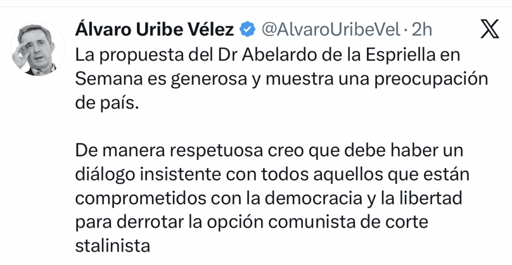 El expresidente Álvaro Uribe Vélez calificó la propuesta como “generosa” y resaltó la necesidad de insistir en un diálogo entre todos los sectores comprometidos con “la democracia y la libertad”.
