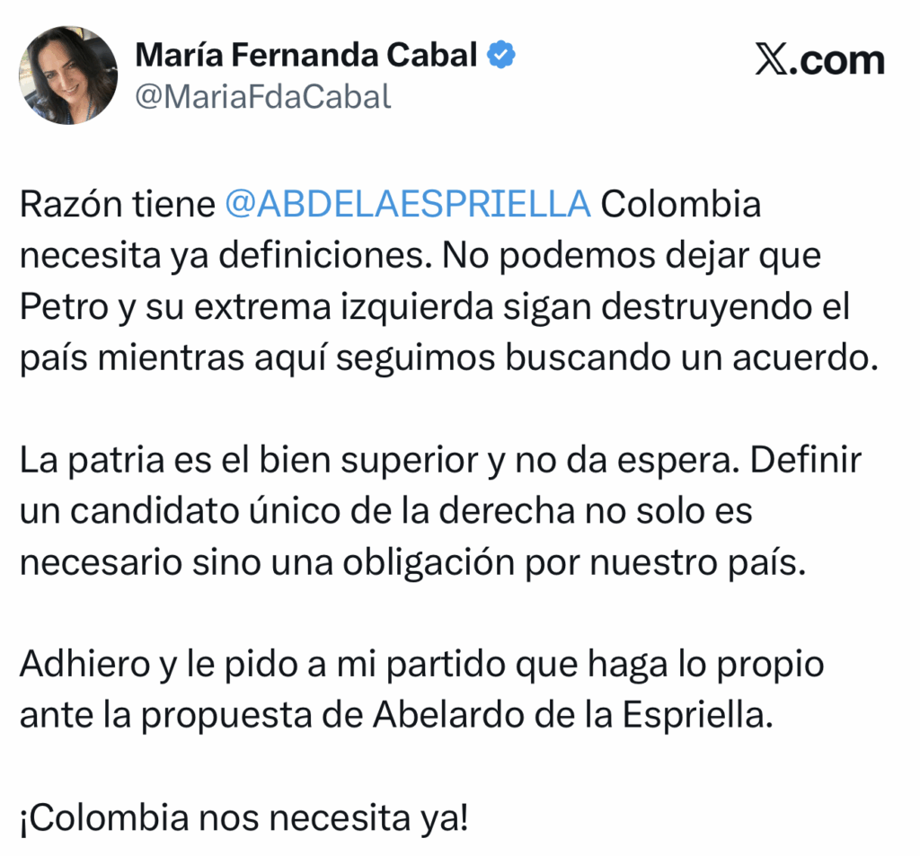 En el mismo sentido, la senadora María Fernanda Cabal elogió la propuesta del candidato y señaló que “Razón tiene Abelardo de la Espriella. Colombia necesita ya definiciones… La patria es el bien superior y no da espera. Definir un candidato único de la derecha no solo es necesario, sino una obligación por nuestro país”.