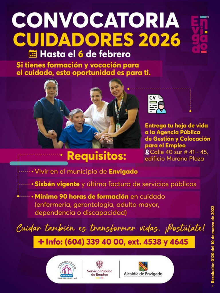 Con el objetivo de fortalecer los procesos de atención y acompañamiento a personas que presentan dependencia derivada de la edad, la enfermedad o alguna discapacidad, así como a brindar apoyo a sus núcleos familiares, la administración de Envigado abrió una convocatoria pública para la postulación de ciudadanos interesados en vincularse a la nueva oferta laboral del programa Cuidadores.