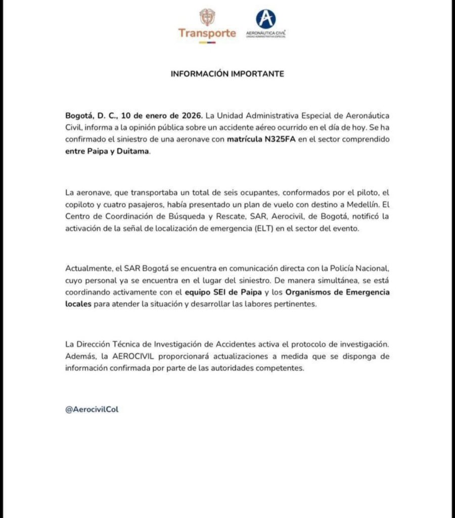 Asimismo, la Dirección Técnica de Investigación de Accidentes activó formalmente el protocolo correspondiente para esclarecer las causas del hecho. Aerocivil señaló que continuará entregando información oficial “a medida que se disponga de información confirmada por parte de las autoridades competentes”.