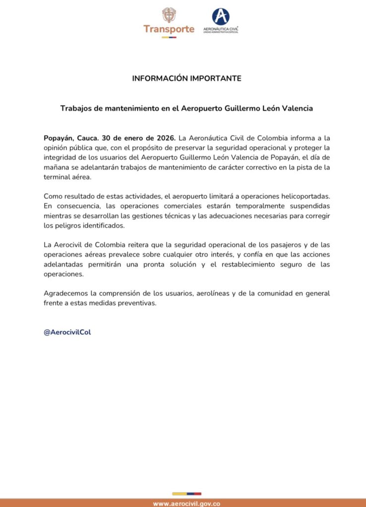 La Aeronáutica Civil informó la limitación temporal de operaciones aéreas en el Aeropuerto Guillermo León Valencia de Popayán debido a labores de mantenimiento programadas sobre la pista de la terminal.