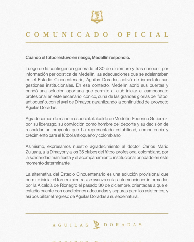 Ubicado en la zona norte de Medellín, cerca del Jardín Botánico y el Parque Explora, este escenario ha sido históricamente la casa del fútbol aficionado y de la Liga Antioqueña de Fútbol. Con el visto bueno de la Dimayor y la logística de Win Sports para la transmisión televisiva, el Cincuentenario se prepara para recibir el rigor de la categoría A. Para Águilas, este cambio representa un reto estratégico: adaptarse rápidamente a una cancha distinta y captar la atención de una afición urbana que ya convive con el fervor de Nacional y Medellín. Por medio de un comunicado, el equipo dorado dio a conocer la noticia.