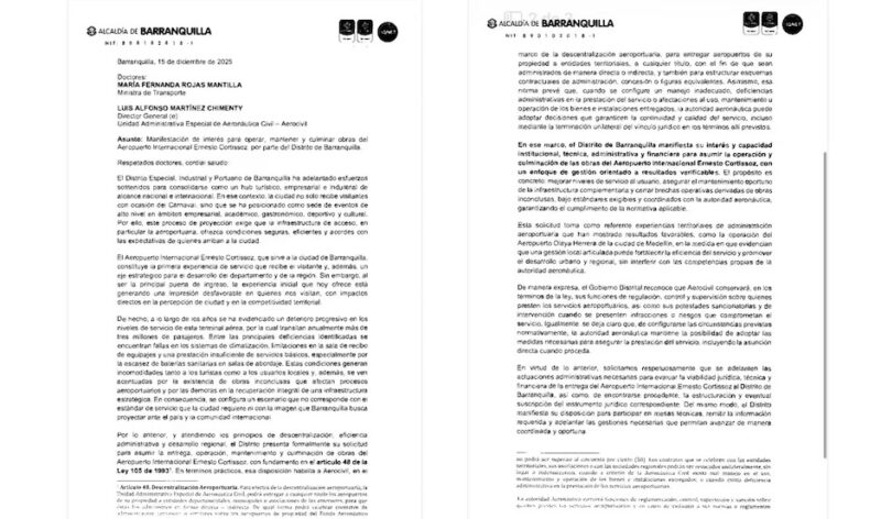 La Alcaldía de Barranquilla formalizó ante el Ministerio de Transporte y la Unidad Administrativa Especial de Aeronáutica Civil su intención de recibir la entrega, operación, mantenimiento y culminación de obras del Aeropuerto Internacional Ernesto Cortissoz. La terminal que moviliza más de tres millones de pasajeros al año y que, según el Distrito, presenta fallas estructurales y operativas.