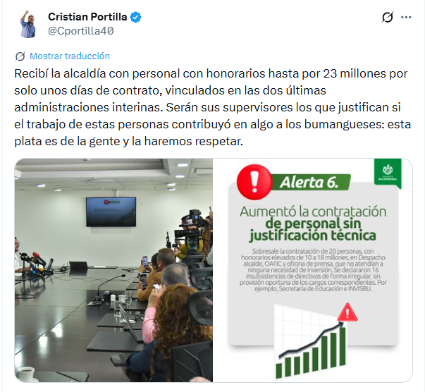 Otro punto destacado por Portilla fue el aumento en la contratación de personal bajo la modalidad de prestación de servicios, sin que, a su juicio, existiera justificación técnica suficiente. En este contexto, mencionó contratos suscritos en áreas adscritas al despacho y a la oficina de prensa, entre ellos uno celebrado con el periodista Rafael Poveda por un periodo cercano a tres semanas, cuya ejecución nunca se llevó a cabo, según indicó, genera cuestionamientos.