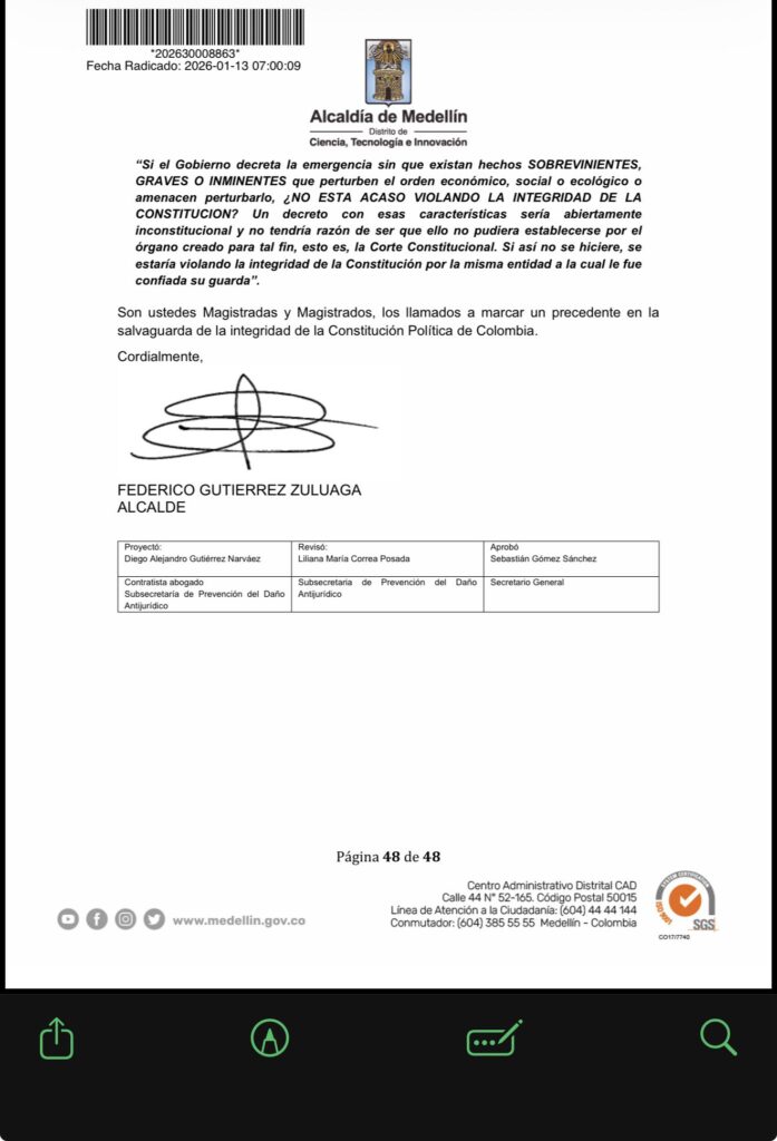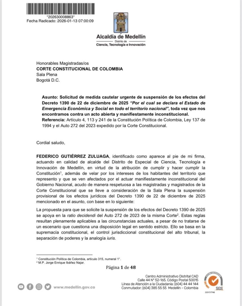 El alcalde de Medellín, Federico Gutiérrez Zuluaga, radicó ante la Corte Constitucional una solicitud de medida cautelar urgente para que se suspendan los efectos del Decreto 1390 del 22 de diciembre de 2025, mediante el cual el Gobierno Nacional declaró el Estado de Emergencia Económica y Social en todo el territorio nacional.