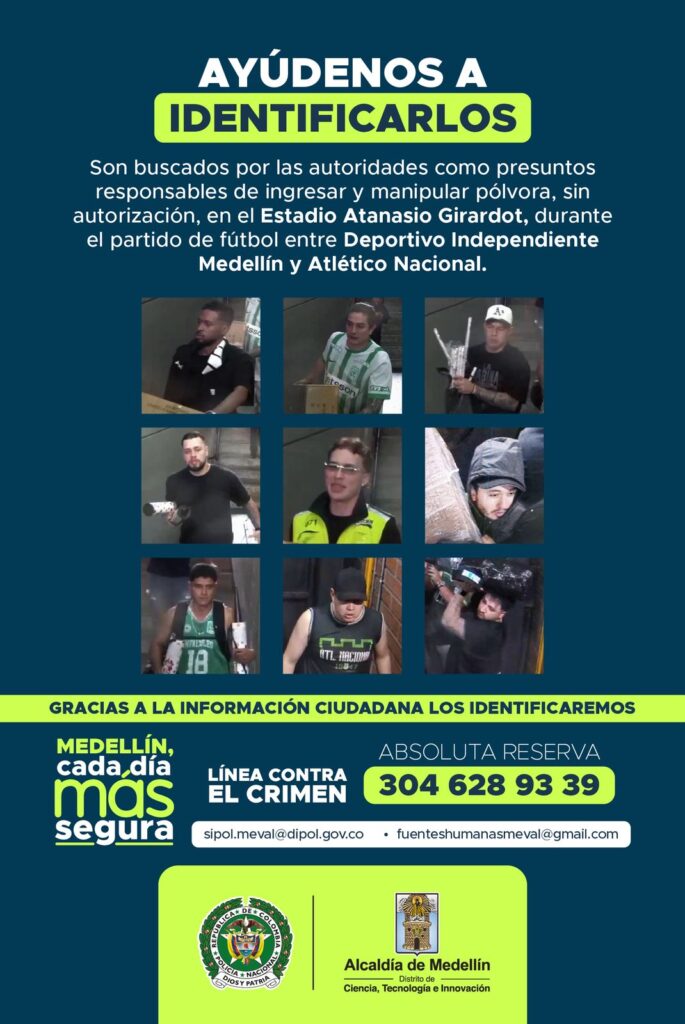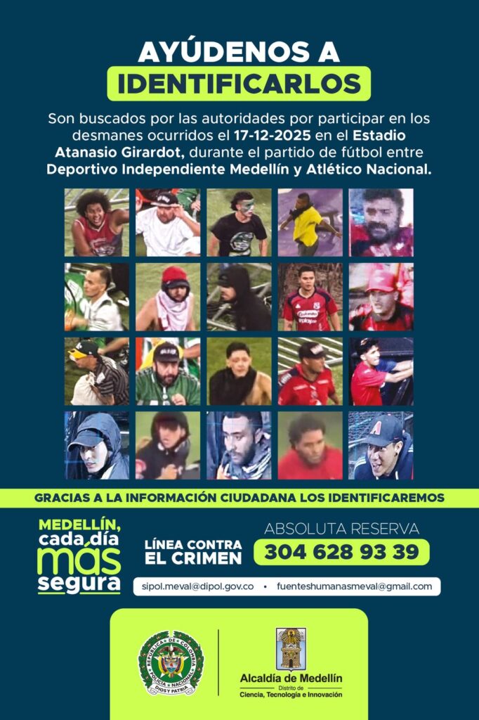 El alcalde detalló las acciones legales que ya se han iniciado: “Cada una de las personas que vamos a mostrar ahora que han sido individualizadas… no solo no podrán entrar al estadio, sino que enfrentarán a la justicia porque las denuncias ya están interpuestas en la Fiscalía, de parte de la Alcaldía, por daño a bien público, tanto al interior como en el exterior del estadio; denuncias de Telemedellín por agresión y amenaza a periodistas; denuncias también del contratista de Wynn, a quien le dañaron vehículos, plantas eléctricas y cámaras”.