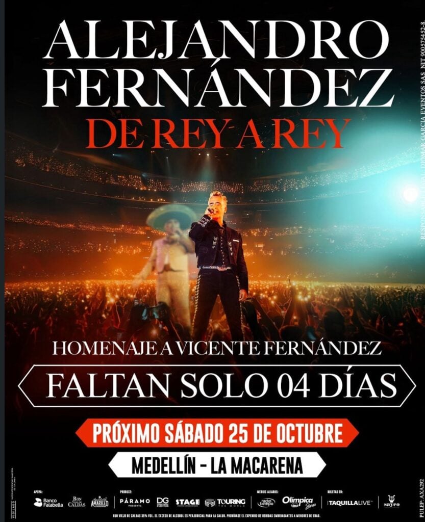 El cantante mexicano Alejandro Fernández confirmó su regreso a Colombia con su gira internacional “De Rey a Rey”, un homenaje a su padre y figura emblemática de la música ranchera, Vicente Fernández. El artista se presentará en Medellín, Bucaramanga y Bogotá entre octubre y noviembre, en una serie de conciertos producidos por Diomar García Eventos, Stage Eventos y Páramo Presenta.