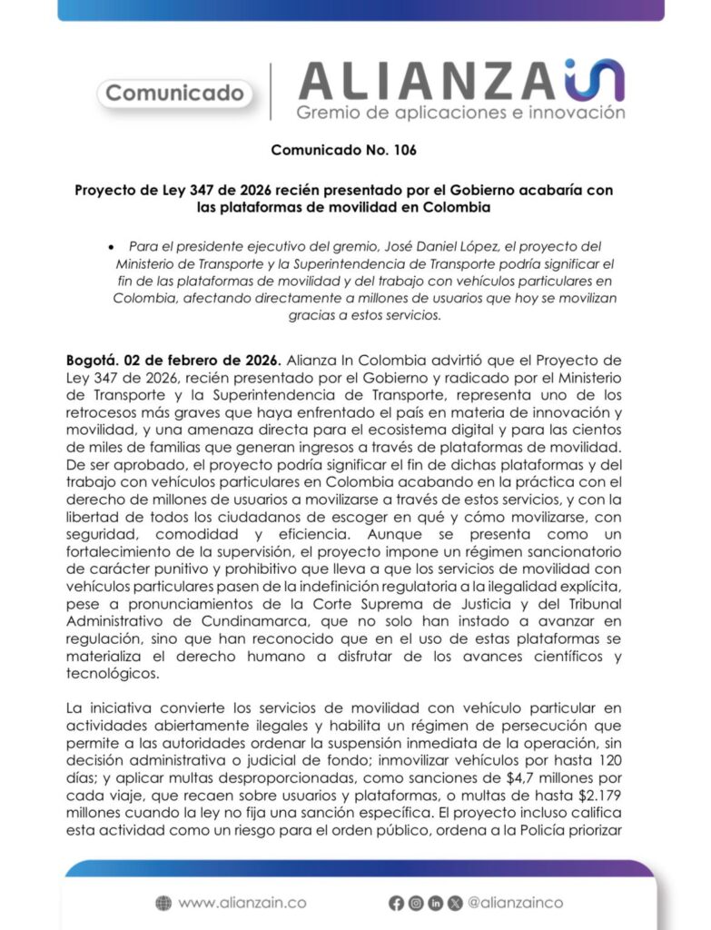 A través del Comunicado No. 106, emitido el 2 de febrero de 2026 en Bogotá, el gremio sostuvo que la iniciativa representa un cambio sustancial en el tratamiento normativo de estos servicios y tendría impactos directos tanto en los usuarios como en las personas que generan ingresos a través de estas plataformas. Según Alianza In, el proyecto “podría significar el fin de las plataformas de movilidad y del trabajo con vehículos particulares en Colombia”.