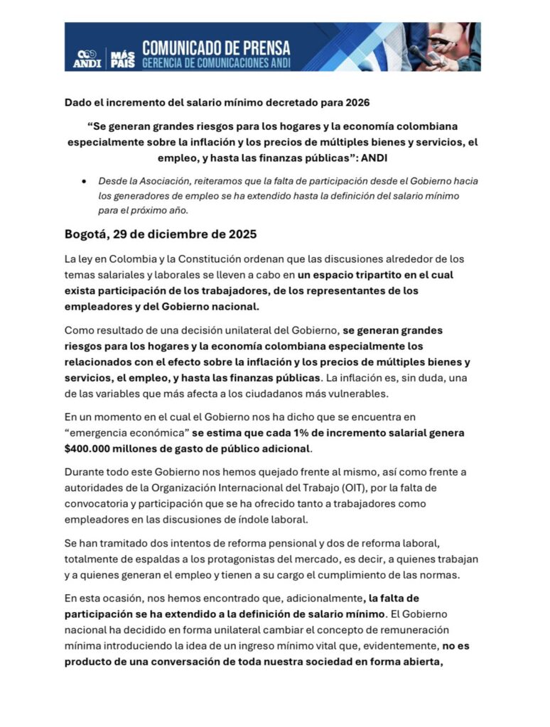 Las observaciones de la Andi se suman así al debate abierto tras la expedición del decreto, en un escenario marcado por posiciones divergentes entre el Gobierno y los sectores productivos frente al alcance y las consecuencias del incremento salarial.