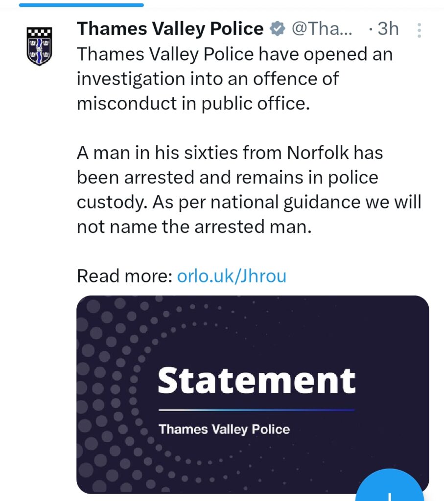 El asistente jefe de Policía, Oliver Wright, señaló que el caso se encuentra en fase preliminar y que se informará sobre avances en el momento oportuno. Diversos medios británicos, identificaron al detenido como Andrew Mountbatten-Windsor.