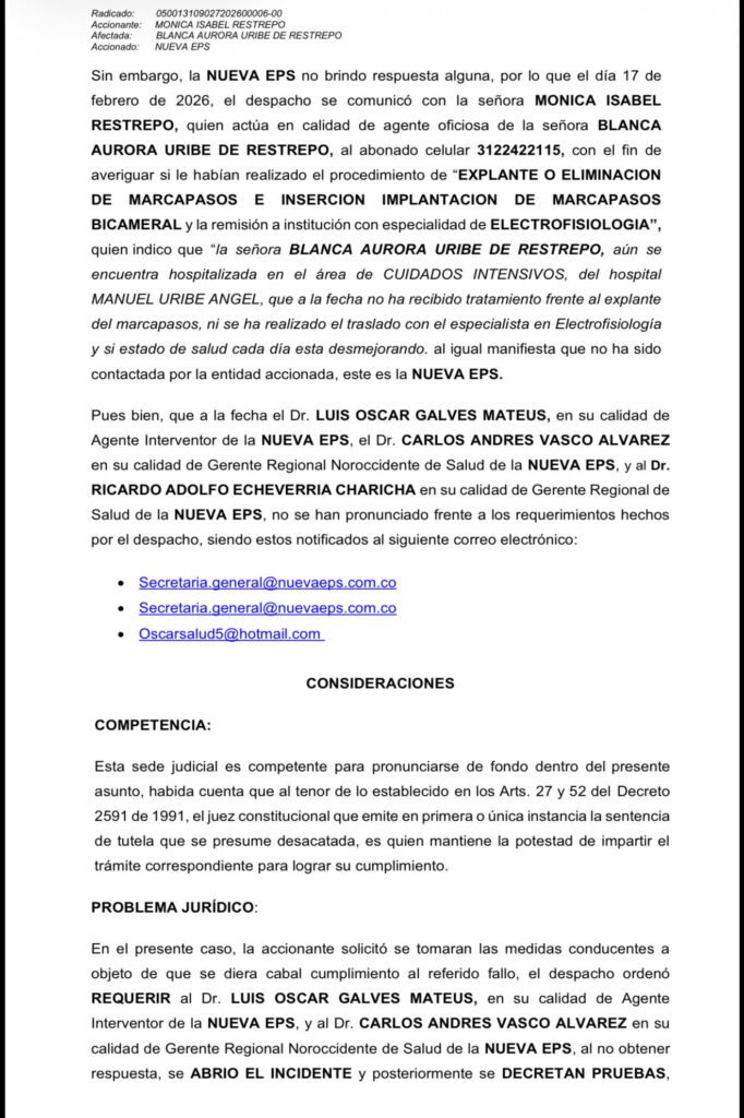 La providencia señaló que el 17 de febrero de 2026 el despacho se comunicó con la agente oficiosa para verificar la situación clínica de la paciente. Según quedó consignado, a esa fecha Blanca Aurora Uribe de Restrepo permanecía hospitalizada en la unidad de cuidados intensivos del Hospital Manuel Uribe Ángel y no había recibido el procedimiento ordenado ni había sido trasladada a un centro con especialista en electrofisiología. El juzgado registró además que su estado de salud se encontraba comprometido.