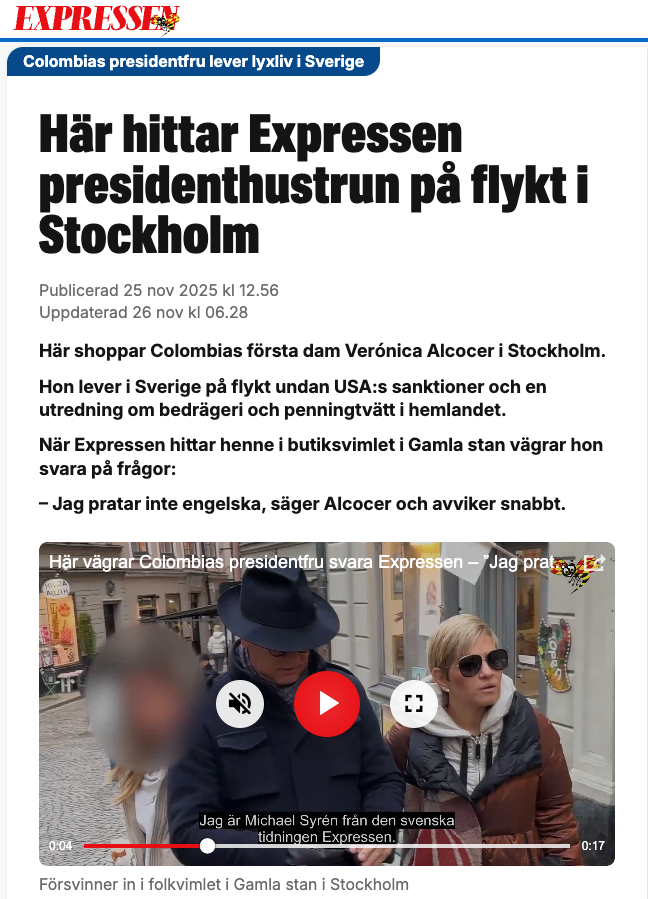 Expressen reveló la semana pasada que la primera dama colombiana, Verónica Alcocer, se ha refugiado en Estocolmo, donde vive una vida de lujo, se divierte con champán y socializa con millonarios de relojes. Algo que ha atraído enorme atención en Colombia. Verónica Alcocer y su esposo, el presidente colombiano Gustavo Petro, fueron incluidos en la lista de sanciones SDN (Ciudadanos Especialmente Designados) del Departamento del Tesoro de Estados Unidos el 24 de octubre. Esto ocurrió tras un importante conflicto con el presidente estadounidense Donald Trump. Estados Unidos acusa a Petro de permitir el drástico aumento de la producción de cocaína en Colombia y de no detener a los cárteles de la droga. Petro acusa a Estados Unidos de matar a un pescador colombiano inocente en uno de los ataques estadounidenses a presuntos barcos cargados de drogas. A las personas incluidas en la lista negra se les congelan los bienes y se les prohíbe hacer negocios con ellas. Compras en Estocolmo Hace unas semanas, la Fiscalía también inició una investigación preliminar en la que Verónica Alcocer es sospechosa de fraude y lavado de dinero en su país de origen.
