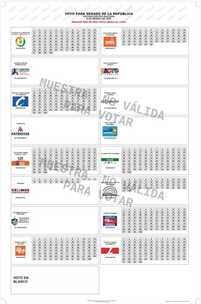La Registraduría Nacional del Estado Civil dio a conocer la disposición del tarjetón electoral que se utilizará en las elecciones al Senado de la República previstas para el 8 de marzo de 2026.