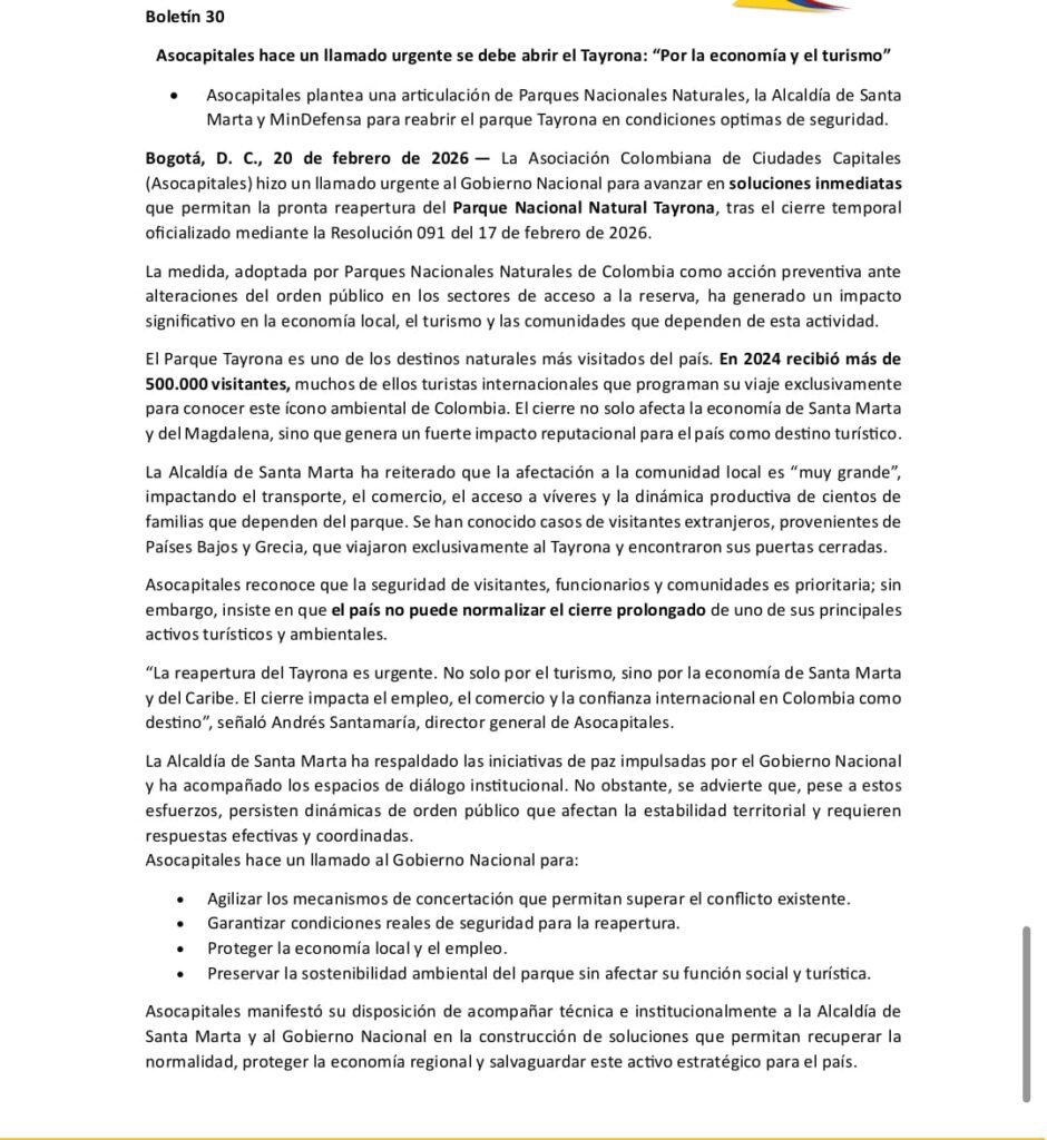La Asociación Colombiana de Ciudades Capitales solicitó al Gobierno Nacional avanzar en decisiones que permitan reabrir el Parque Nacional Natural Tayrona, cerrado de manera temporal mediante la Resolución 091 del 17 de febrero de 2026. La medida fue adoptada por Parques Nacionales Naturales de Colombia como acción preventiva ante alteraciones del orden público en los accesos al área protegida.