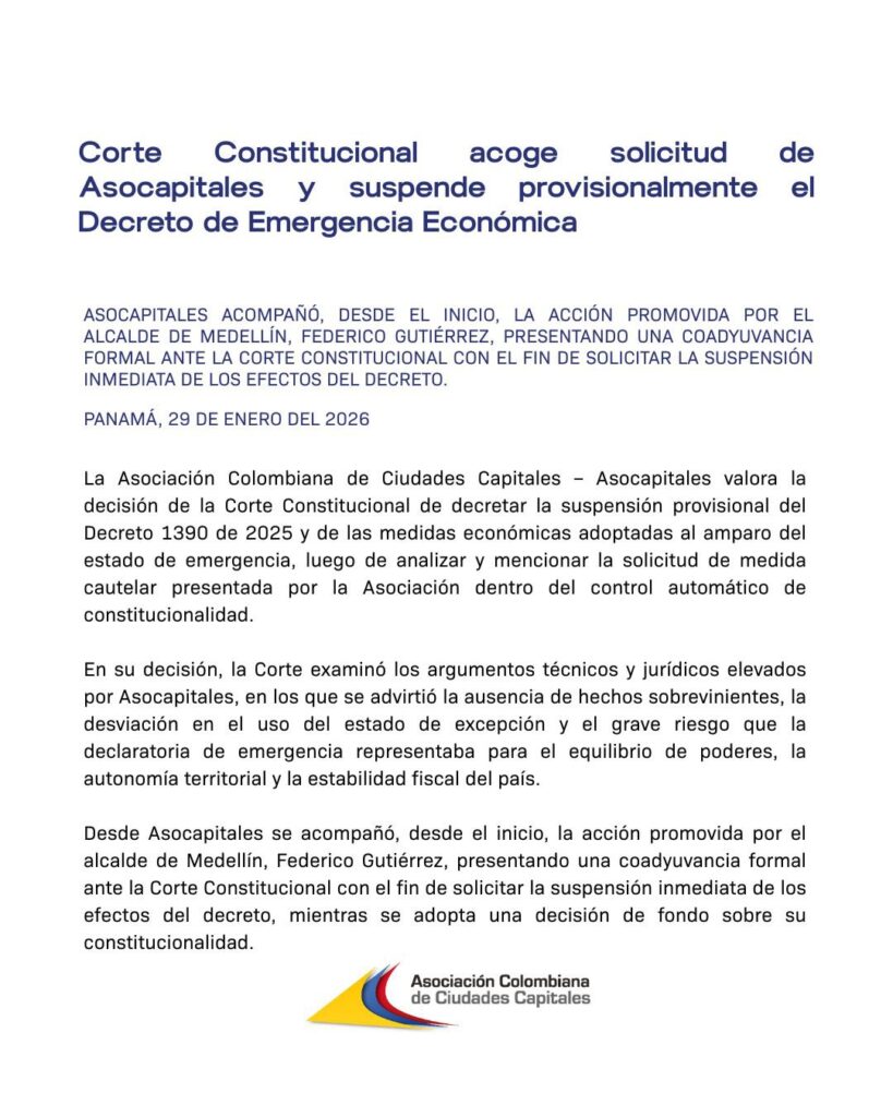 En un comunicado fechado en Panamá el 29 de enero de 2026, la Asociación Colombiana de Ciudades Capitales informó que valora la decisión del alto tribunal de suspender provisionalmente el Decreto 1390 de 2025 y las medidas económicas adoptadas al amparo del estado de emergencia. Según se indicó, la Corte tuvo en cuenta la solicitud de medida cautelar presentada por Asocapitales dentro del trámite constitucional correspondiente.