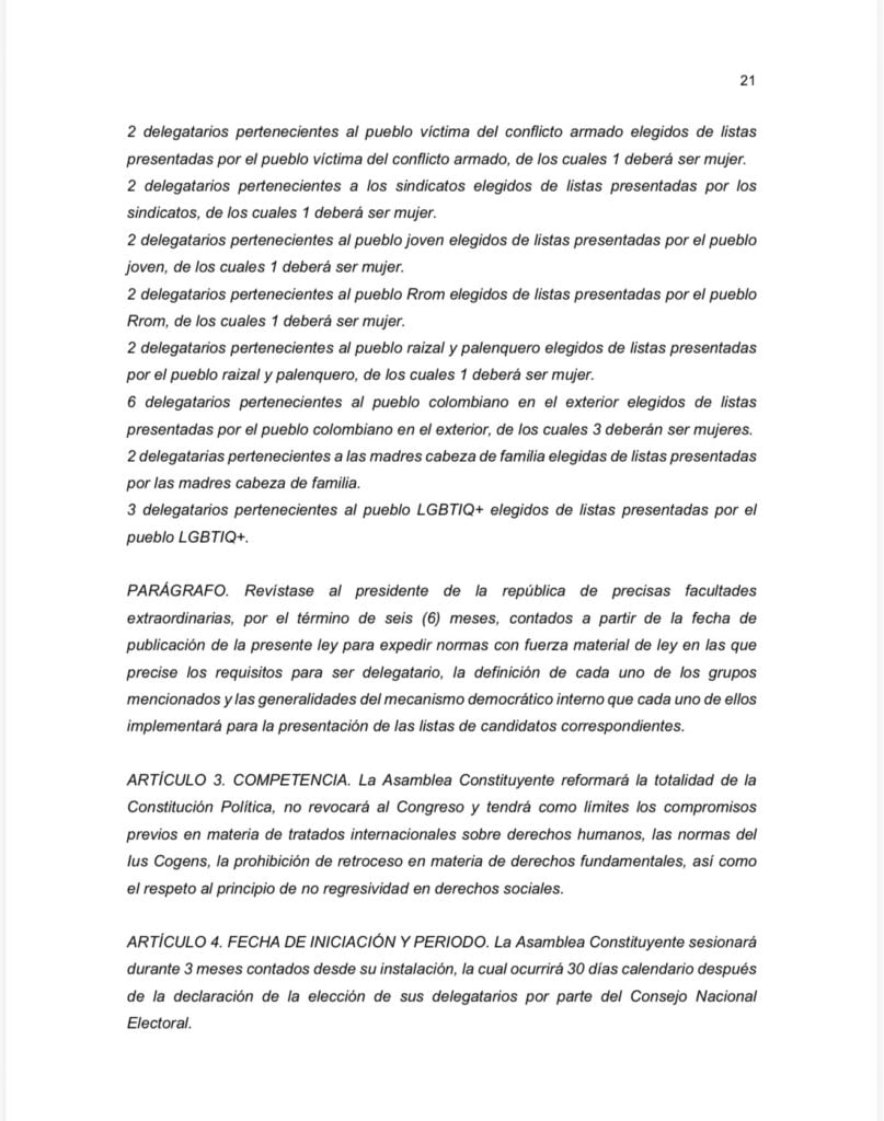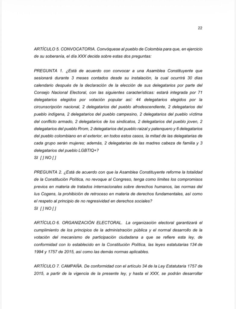 El proyecto establece la realización de una consulta nacional con dos preguntas. La primera, relacionada con la convocatoria de una Asamblea Constituyente compuesta por 71 delegatarios, quienes serían elegidos mediante votación popular. De los 71 miembros, 44 corresponderían a circunscripción nacional y el resto sería seleccionado por sectores específicos: pueblos afrodescendientes, indígenas, campesinos, víctimas del conflicto armado, sindicatos, juventud, comunidad Rrom, raizales y palenqueros, colombianos en el exterior, madres cabeza de familia y población LGBTIQ+. En cada caso, se establece que la mitad de las curules deberá estar ocupada por mujeres.