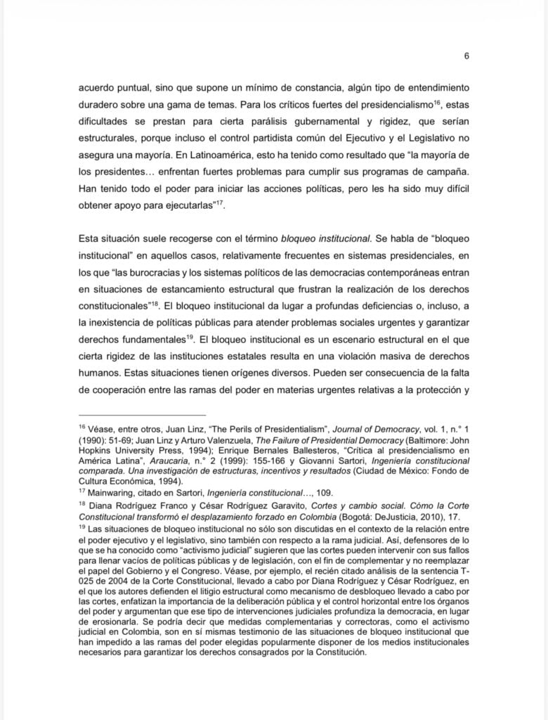 La exposición sostiene que el denominado “bloqueo institucional” ha resultado en “profundas deficiencias o, incluso, inexistencia de políticas públicas para atender problemas sociales urgentes y garantizar derechos fundamentales”. Además, señala que la confrontación entre ramas del poder puede desembocar en “estancamiento estructural” que frustre la realización de derechos constitucionales.