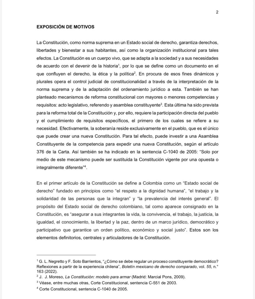 El documento plantea que la Constitución, como norma suprema del Estado social de derecho, es un “cuerpo vivo” que se adapta a las necesidades de la sociedad y que, ante las dificultades actuales entre las ramas del poder, sería necesario activar el mecanismo previsto en el artículo 376 de la Carta Política. Según la exposición presentada, “solo por medio de este mecanismo puede ser sustituida la Constitución vigente por una opuesta o integralmente diferente”, citando la sentencia C-1040 de 2005.