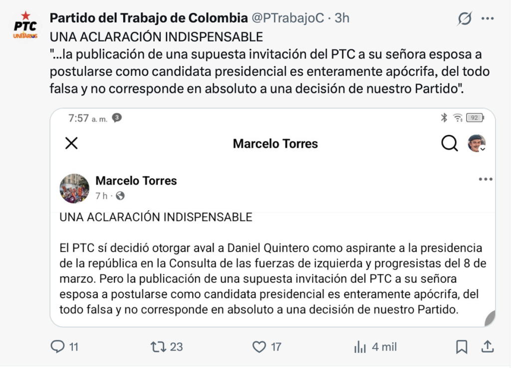 …la publicación de una supuesta invitación del PTC a su señora esposa a postularse como candidata presidencial es enteramente apócrifa, del todo falsa y no corresponde en absoluto a una decisión de nuestro Partido», afirmó la organización política.