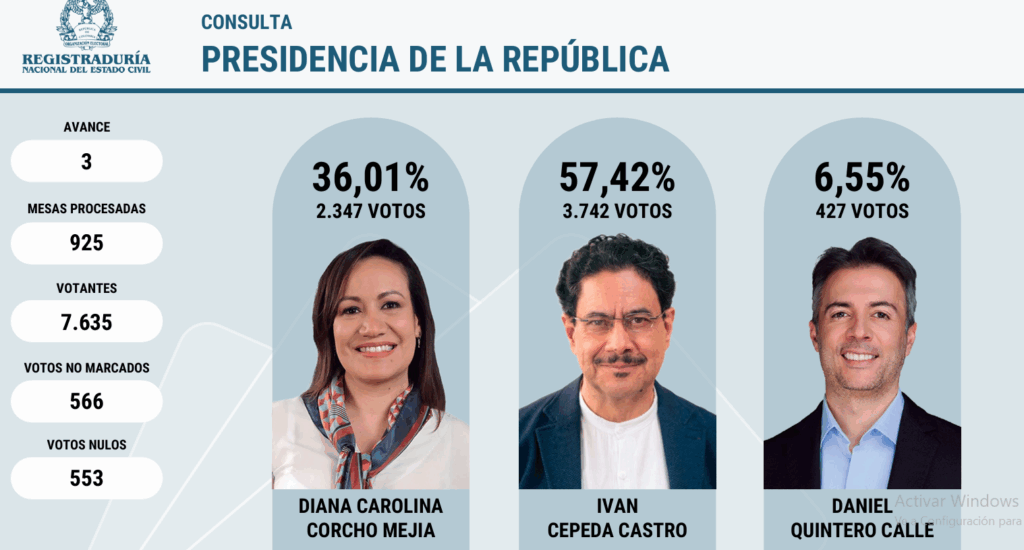 Con un total de 925 mesas procesadas, que representan 7.635 votos, se tiene que el 57,42% de los votos son a favor de este senador del Polo Democrático, seguido de Carolina Corcho quien de acuerdo a este boletín tiene el 36,01% de los votos, y finalmente y a pesar de que se reiteró que ya no hacía parte de la consulta, se ubica a Daniel Quintero, el exalcalde de Medellín imputado con el 6,5% de los votos que equivale a 427 votos.