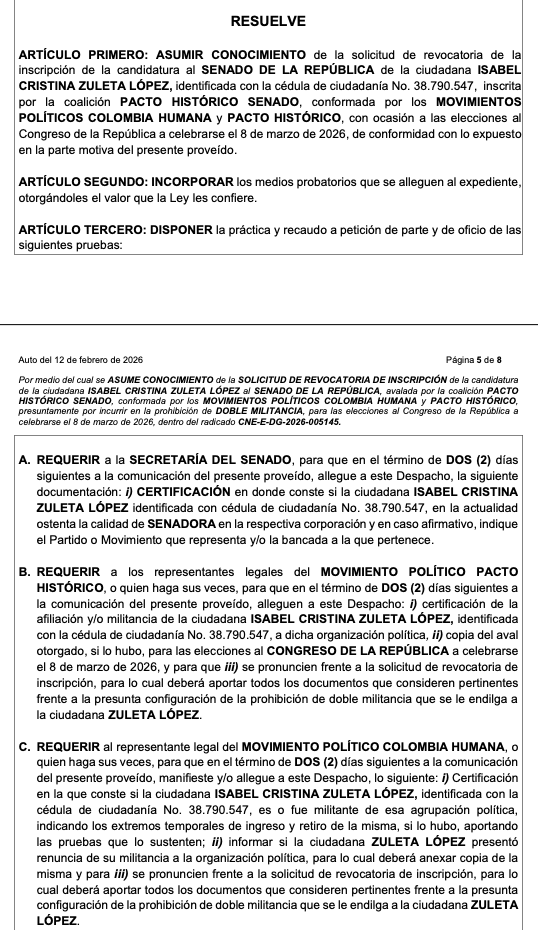 El CNE, en los autos conocidos, solicitó al Congreso de la República y a los partidos Colombia Humana y Pacto Histórico la remisión de certificaciones y documentos que permitan establecer la filiación política de los candidatos, así como las fechas de eventuales renuncias y nuevas inscripciones. Con base en esas pruebas, el organismo deberá determinar si se configuró o no la doble militancia.