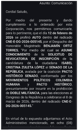 De confirmarse esa situación, los candidatos involucrados podrían quedar por fuera del proceso electoral al Congreso, cuya jornada está prevista para el próximo 8 de marzo. Sin embargo, el trámite apenas inicia formalmente con el auto de avocación, lo que implica la apertura de la etapa de análisis y verificación probatoria antes de una decisión de fondo.