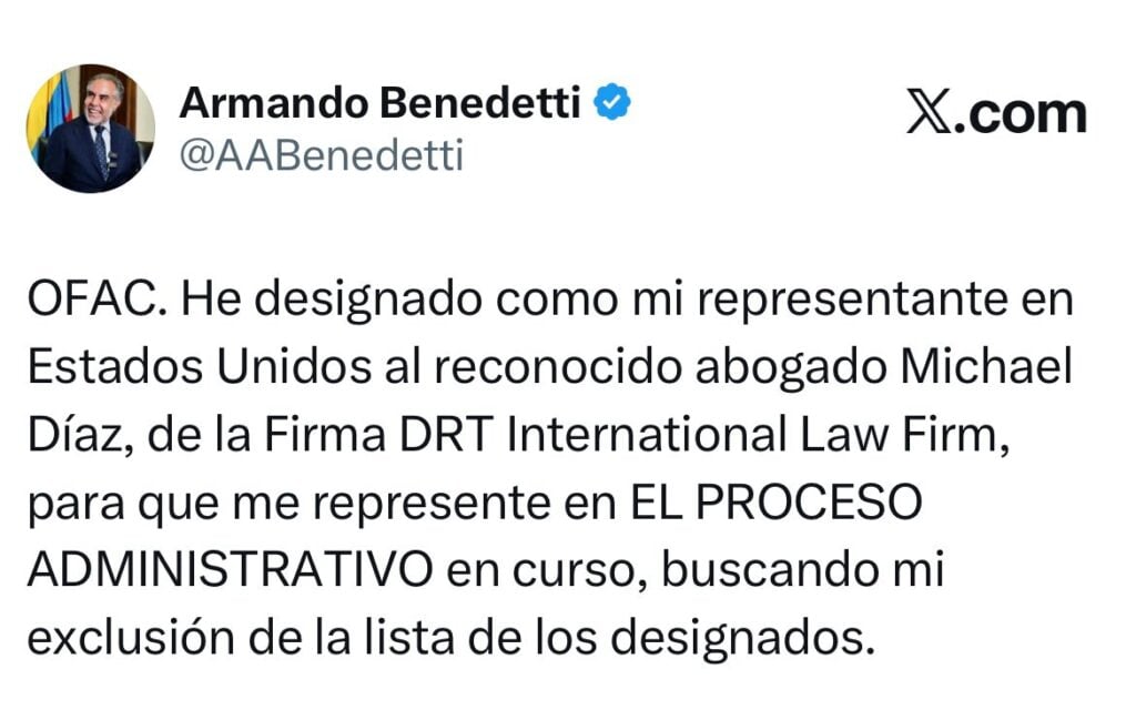 El ministro del Interior, Armando Benedetti, designó al abogado Michael Díaz, de la firma DRT International Law Firm, como su representante legal en Estados Unidos, en el marco del proceso que adelanta la Oficina de Control de Activos Extranjeros (OFAC) para buscar su exclusión de la denominada “lista Clinton”.