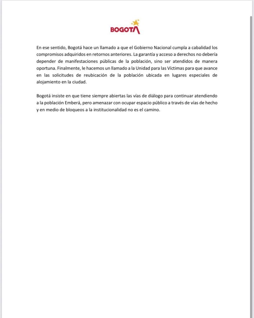En su pronunciamiento, Bogotá instó a la Unidad a avanzar en las solicitudes de reubicación de las familias que aún permanecen en los albergues, y subrayó que la atención y el acceso a derechos no deben depender de manifestaciones o bloqueos.