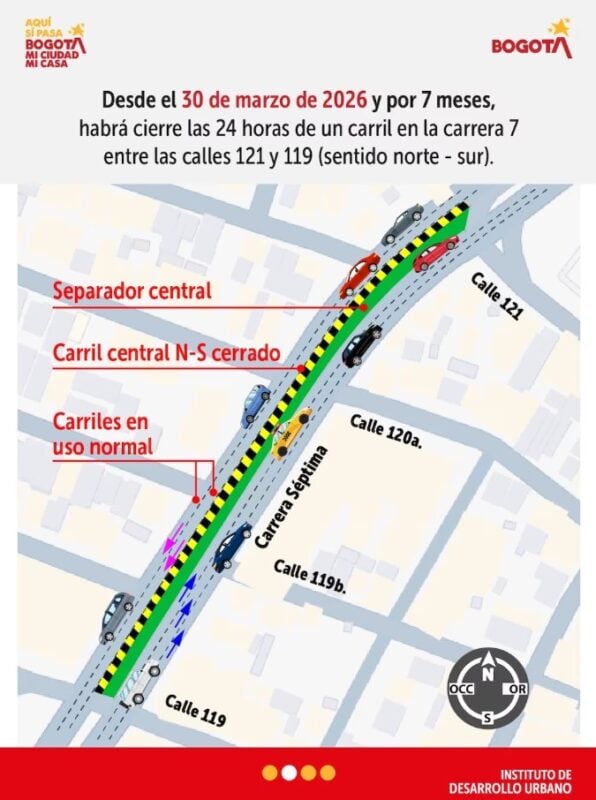 De acuerdo con el Instituto de Desarrollo Urbano, se implementó el cierre permanente de un carril central en sentido norte-sur mientras avanzan los trabajos iniciales del proyecto. La medida se extenderá durante aproximadamente siete meses y hace parte de la ejecución del denominado corredor verde, una intervención que abarca distintos segmentos de la vía. Durante este periodo, las autoridades mantendrán habilitados al menos dos carriles por sentido para la circulación de vehículos mixtos, con el fin de sostener el flujo vehicular en este corredor.