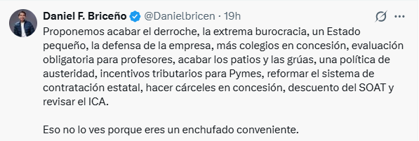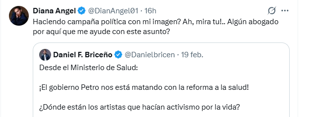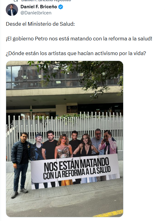 Briceño, quien aspira a la Cámara de Representantes por el Centro Democrático, publicó: “Desde el Ministerio de Salud: ¡El gobierno Petro nos está matando con la reforma a la salud! ¿Dónde están los artistas que hacían activismo por la vida?”. La expresión retoma uno de los lemas más difundidos durante el estallido social de 2021 y lo traslada al debate sobre el sistema sanitario.