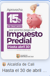 Con el objetivo de incentivar el cumplimiento oportuno del pago del Impuesto Predial Unificado en Cali, la administración informó que los contribuyentes del municipio ya pueden acceder a un descuento del 15 % por pronto pago.