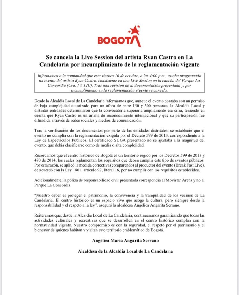 El evento Live Session que el cantante de música urbana Ryan Castro tenía previsto realizar este viernes 10 de octubre en el centro de Bogotá fue cancelado por las autoridades locales debido al incumplimiento de los requisitos exigidos por la normativa vigente para espectáculos públicos.
