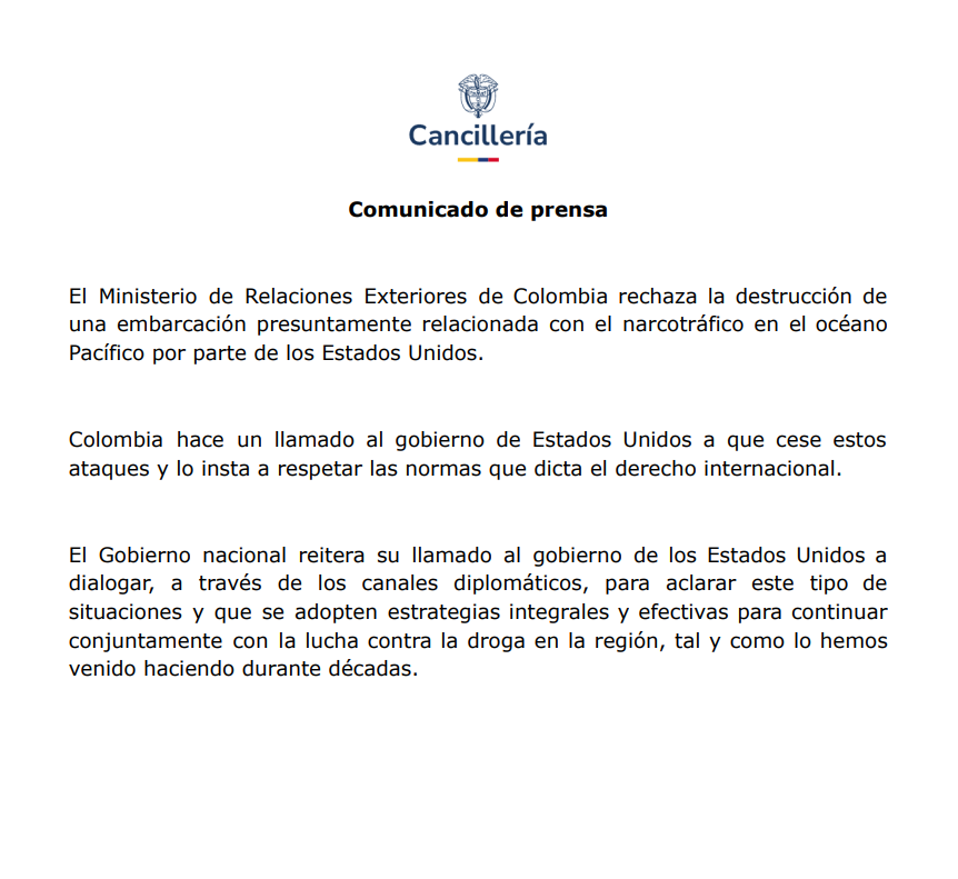 A través de un comunicado oficial, la Cancillería señaló que “el Ministerio de Relaciones Exteriores de Colombia rechaza la destrucción de una embarcación presuntamente relacionada con el narcotráfico en el océano Pacífico por parte de los Estados Unidos”, y subrayó que esta situación vulnera las normas internacionales que regulan las actuaciones entre Estados soberanos.