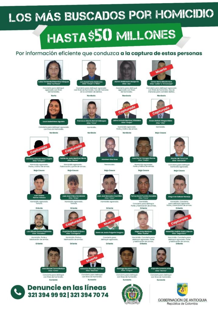 La Gobernación de Antioquia reiteró que continúa vigente el ofrecimiento de hasta 50 millones de pesos como recompensa por información que permita la captura de las otras 18 personas que aún figuran en el cartel de los más buscados por homicidio en el departamento.