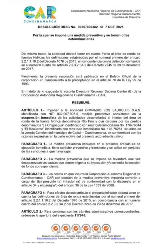 La Corporación Autónoma Regional de Cundinamarca (CAR) impuso una medida preventiva al Gimnasio Campestre Los Laureles, ubicado en el municipio de Cajicá, tras establecer presuntos incumplimientos ambientales en el área colindante con el río Frío, sector en el que ocurrió la desaparición y posterior hallazgo sin vida de la menor Valeria Afanador.
