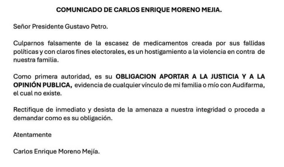 Moreno, quien ha ocupado cargos de relevancia en el sector empresarial y que ha sido cercano a gobiernos anteriores, le exige al presidente Petro revelar cualquier prueba que respalde sus insinuaciones sobre presuntos vínculos con la empresa Audifarma. “Como primera autoridad, es su obligación aportar a la justicia y a la opinión pública evidencia de cualquier vínculo de mi familia o mío con Audifarma, el cual no existe”, señala de manera directa.
