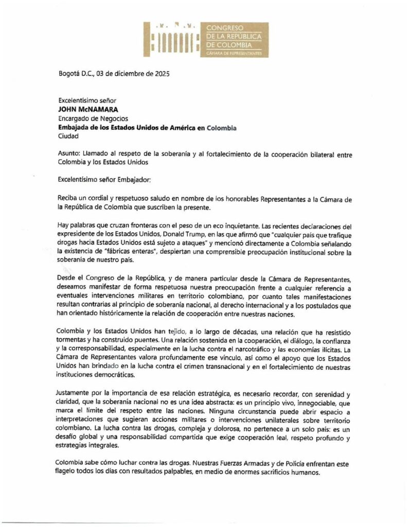 El presidente de la Cámara de Representantes, Julián López, envió una comunicación formal al encargado de negocios de Estados Unidos en Colombia, John McNamara, en la que manifestó preocupación por las declaraciones del presidente estadounidense Donald Trump.
