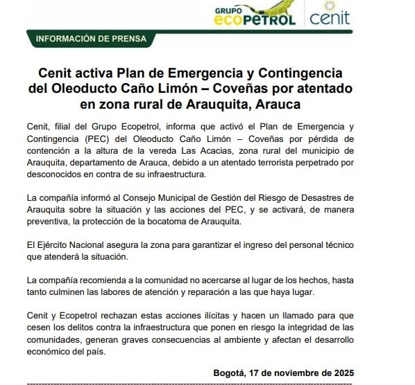 De acuerdo con la empresa, la activación del PEC responde estrictamente al protocolo establecido para este tipo de incidentes. Cenit señaló que la afectación ocurrió “a la altura de la vereda Las Acacias, zona rural del municipio de Arauquita, departamento de Arauca, debido a un atentado terrorista perpetrado por desconocidos en contra de su infraestructura”. Ante esta situación, la compañía aseguró que se mantiene la coordinación con las autoridades locales y regionales para atender la emergencia de manera oportuna.