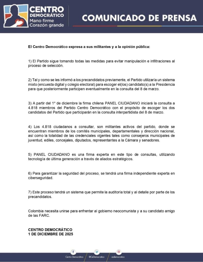 El comunicado detalla que a partir del 1 de diciembre, la firma chilena Panel Ciudadano será la encargada de realizar la consulta a 4.818 miembros activos del partido. El objetivo es seleccionar a los dos aspirantes que competirán en la contienda interpartidista. Entre los consultados hay integrantes de los comités municipales, departamentales, la dirección nacional, además de concejales, ediles, diputados, representantes a la Cámara, senadores y consejeros municipales de juventud con credenciales vigentes.