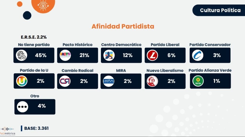 Además, un 45% de los consultados afirmó no sentirse identificado con ningún partido, mientras que el Pacto Histórico conserva el 21%, el Centro Democrático el 12%, el Partido Liberal el 6% y el Partido Conservador apenas el 3%.