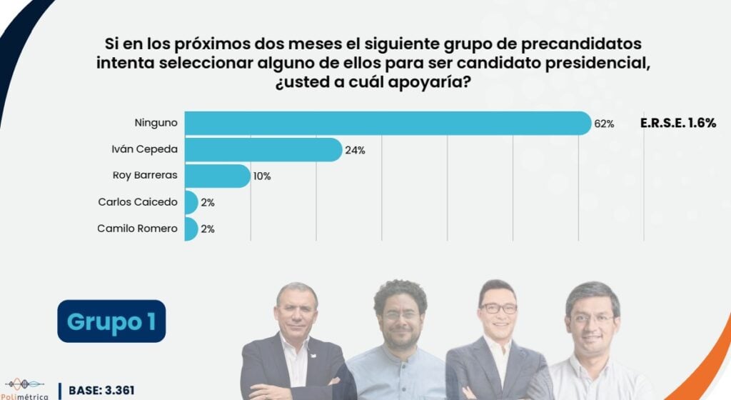 La encuesta también midió la intención de voto para las consultas interpartidistas previstas en marzo de 2026. En la del Frente Amplio, el senador Iván Cepeda encabeza con el 24%, seguido de Roy Barreras con 10% y Camilo Romero y Carlos Caicedo con 2%.