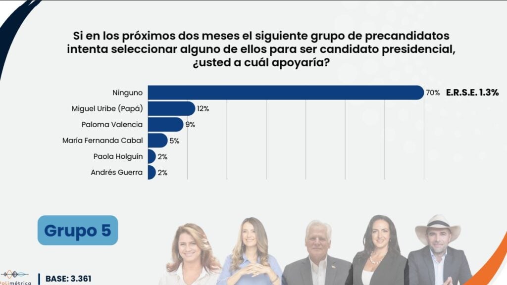 Por el lado del Centro Democrático, Miguel Uribe Londoño obtiene el 12%, Paloma Valencia el 9% y María Fernanda Cabal el 5%, aunque el 70% de los votantes dijo que no apoyaría a ninguno.