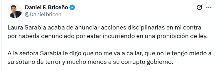 Tras la réplica de la defensa, el intercambio continuó. Briceño aseguró, a través de la misma red social, que Sarabia anunció acciones disciplinarias en su contra por haberla denunciado. En ese pronunciamiento, el concejal dijo que no dejará de denunciar lo que considera irregularidades y reiteró su propósito de que la Procuraduría investigue los hechos.