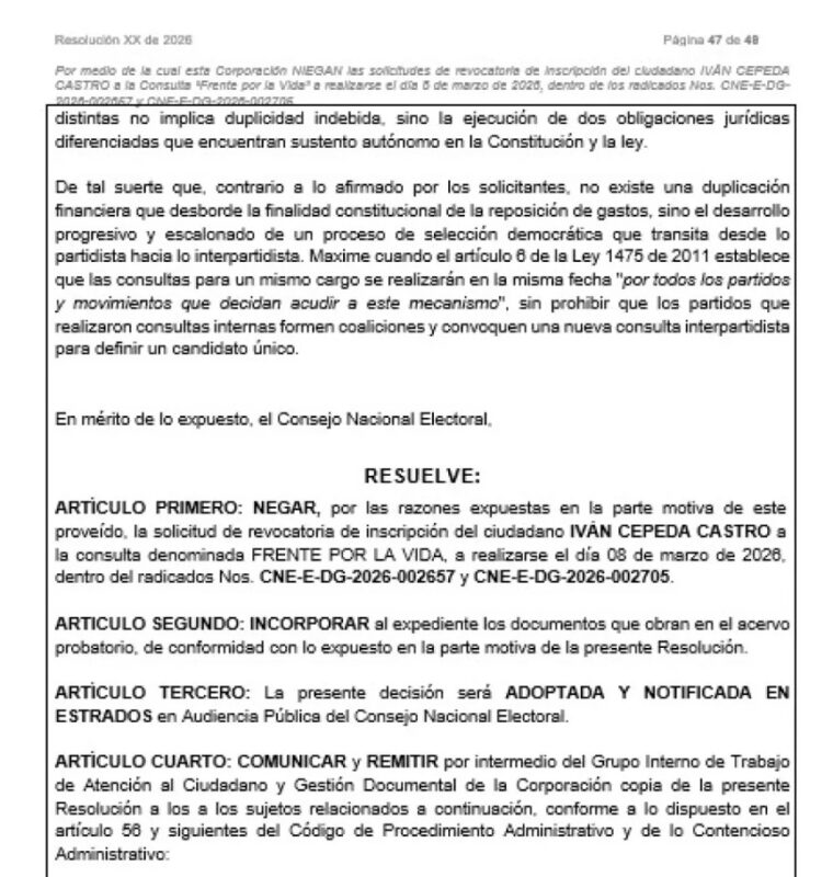 La decisión del CNE definirá si Cepeda podrá competir en la consulta junto a otros precandidatos inscritos. La Registraduría, entretanto, rechazó la inscripción de Daniel Quintero, cuyo caso continúa en revisión. El tribunal electoral tiene previsto votar la ponencia tras el estudio del documento radicado, en una sesión que marcará el rumbo del proceso previo a la jornada electoral de marzo.