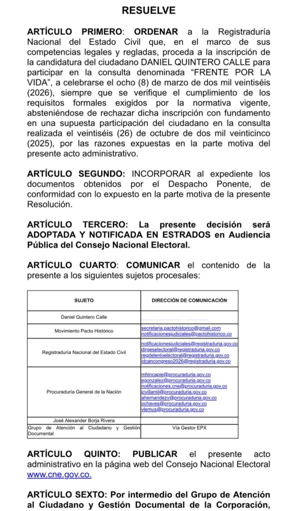 El Consejo Nacional Electoral ratificó la orden de inscribir a Daniel Quintero Calle como precandidato en la consulta interpartidista del Frente por la Vida del 8 de marzo de 2026. La resolución ya fue adoptada formalmente por la sala plena del tribunal electoral y establece que la autoridad registral debe proceder con la inscripción, siempre que se cumplan los requisitos legales exigidos por la normativa vigente.