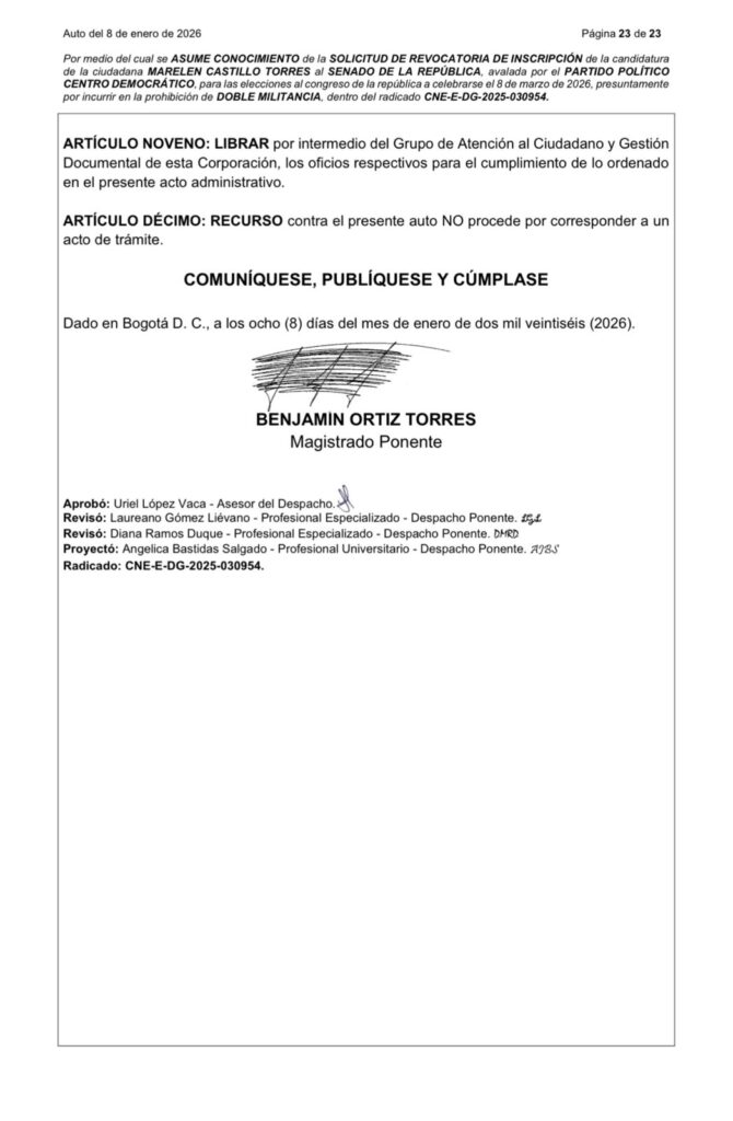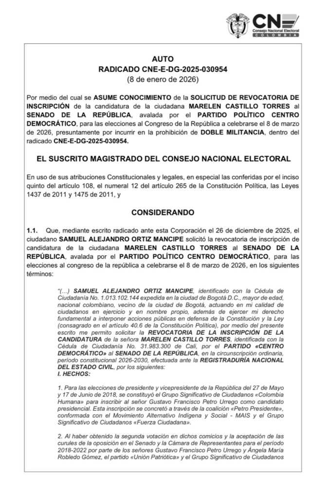 El proceso es adelantado por el magistrado Benjamín Ortiz Torres, quien emitió el auto correspondiente el pasado 8 de enero de 2026. En el documento se señala que la solicitud fue presentada por Samuel Alejandro Ortiz Mancipe y plantea cuestionamientos sobre la legalidad de la inscripción de Castillo, al considerar que actualmente ocupa una curul en la Cámara de Representantes obtenida por una colectividad distinta a la que ahora la avala para aspirar al Senado.