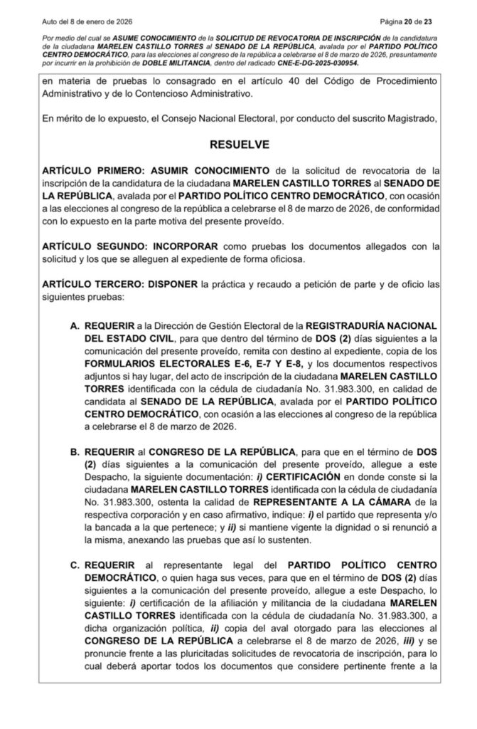 Asimismo, el CNE solicitó al Congreso de la República certificar si Castillo Torres continúa ejerciendo su curul en la Cámara, el partido o bancada a la que pertenece y si ha presentado renuncia a dicha dignidad. De manera paralela, se pidió al Centro Democrático entregar una certificación sobre la afiliación y militancia de la congresista, copia del aval otorgado para las elecciones legislativas de 2026 y un pronunciamiento formal frente a la solicitud de revocatoria.