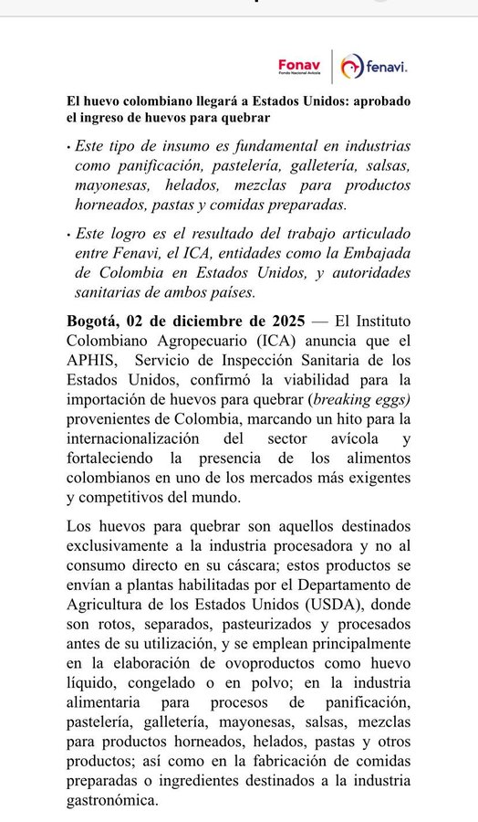 Por su parte, la ministra de Comercio, Industria y Turismo, Diana Marcela Morales, confirmó la autorización a través de su cuenta oficial en X. La funcionaria señaló que Estados Unidos aprobó la exportación desde Colombia de huevos con cáscara para su procesamiento industrial, resultado de un trabajo conjunto entre el ICA, la Embajada de Colombia en Washington y Fenavi.