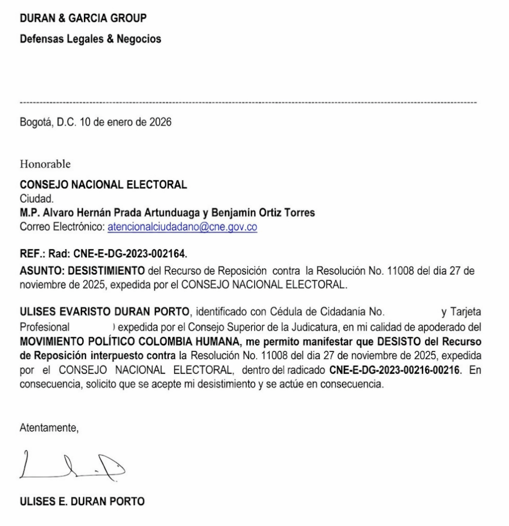 La información se conoció luego de que el apoderado del movimiento, Ulises Durán, radicara un memorial ante el CNE en el que manifestó de manera expresa el desistimiento del recurso presentado contra la Resolución No. 11008 del 27 de noviembre de 2025. En el documento, dirigido a los magistrados Benjamín Ortiz y Álvaro Hernán Prada, el abogado solicitó que se aceptara formalmente el retiro del recurso y que se actuara conforme a lo resuelto por la autoridad electoral.